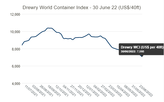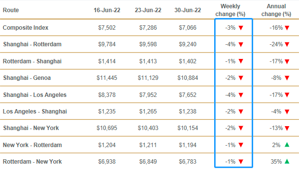同时,英国咨询机构德路里(Drewry)发布的最新一期世界集装箱综合运价指数(WCI)也显示上周运价继续下跌3%至7066.03美元/FEU。